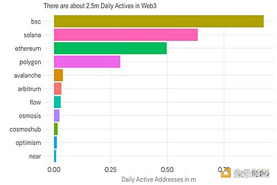 从数据来看,头部公链上每天有 250 万个钱包处于活跃状态,BNB Chain、Solana、Polygon 和 Ethereum占 80% 以上。