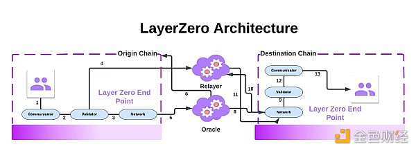 Layer Zero 是通用互操作性解决方案之一,也是第一个没有自己的原生共识系统的跨链协议。“Omnichain”网络通过使用两个独立实体连接不同链上已建立的端点或智能合约来发挥作用:预言机和中继器。预言机是第三方服务,负责从源链(链 A)获取区块信息并在目标链(链 B)上广播这些信息。而中继器是链下实体(可由开发人员自己管理),负责在链 A 和 B 之间传递交易证明以确保交易的有效性。这种将中继器与预言机分离的模型使得协议只有在这两方相互勾结时才会受到恶意活动的影响。