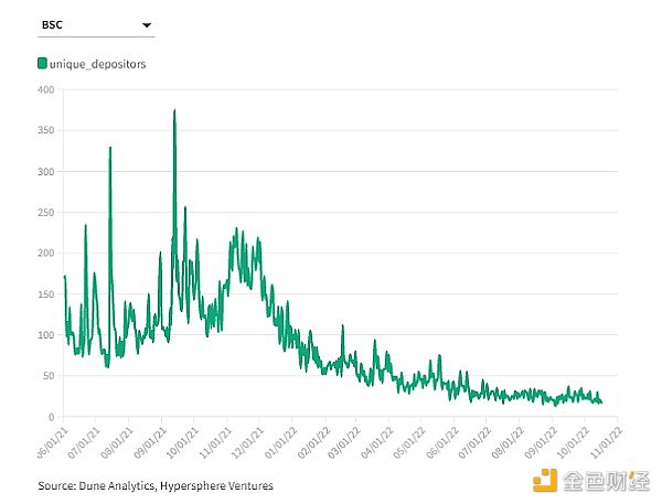 从以上图表中我们得知,自 2021 年 11 月以来,跨链存款人的数量一直呈下降趋势。与 2022 年 8 月的链上分析相比,业内最成功的替代 L1 Polygon、BSC 和 Avalanche,其每月存款人分别减少了约 42%、86% 和 95%。