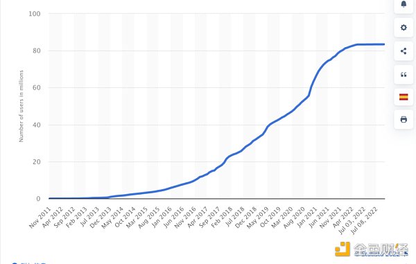 图:2011 年 11 月至 2022 年 7 月 11 日全球钱包用户数(百万)