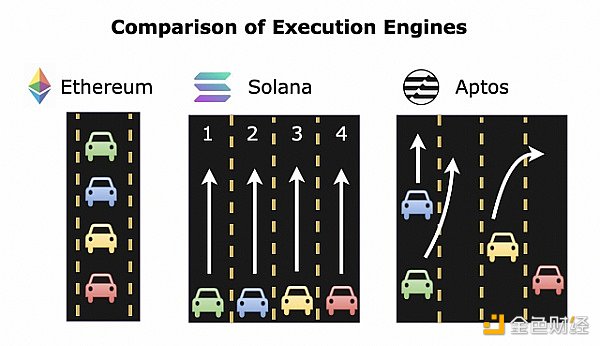 但这与 Solana 和其他并行执行引擎相比如何?Solana 的主要创新是对其所有智能合约依赖项进行硬编码,以使其能够并行执行。有了预先知道的所有依赖项,Solana 执行引擎就可以在运行前锁定必要的依赖项。但 Aptos 是动态管理依赖关系,首先“乐观地”运行所有事务,然后在失败的情况下重新运行那些失败的特定事务。