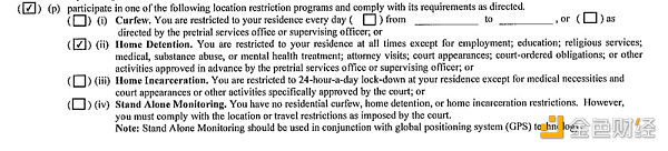 法庭文件显示,SBF 将在其父母在 Palo Alto 的家中接受“家庭拘留(Home Detention)”。此外,他还必须佩戴电子监控手环并接受心理健康咨询。