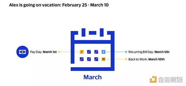考虑一个场景:假设今天是 2 月 25 日,爱丽丝要去阿尔卑斯山度假,她将于 3 月 10 日返回,但又必须在每个月的 5 日之前支付房贷、有线电视费和水电费,问题是她在休假前并没有足够的钱去付款,不过在 3 月 1 日领到薪水时就会有足够的钱。现在问题来了,爱丽丝如何在不拖欠付款的情况下享受她的假期?