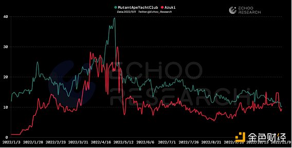 从8月的相对低点到目前的走势来看中,Mutant Ape Yacht Club的地板价格下跌了11%,而Azuki地板价涨幅60%,Azuki在近期价格走势中要优于Mutant Ape Yacht Club。近期两者价格开始逐渐接近,但在对比历史价格表现后,目前Mutant Ape Yacht Club买入的价格性价比仍然要高于Azuki。