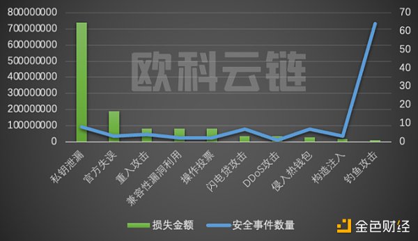 钓鱼攻击是以太坊链上最常见的攻击手法,而导致损失最大的则是私钥泄露。其余类型攻击手法所导致的安全事件数量与损失金额均处于正常水平。