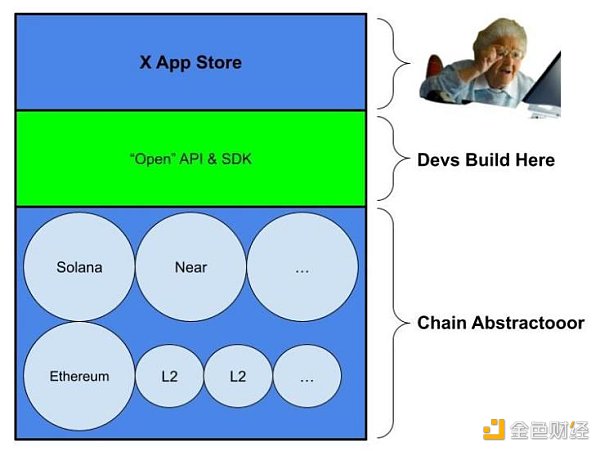 底层为公链和L2,中层为“开源”API和SDK,上层为超级应用商店超级应用最终有望成为以太坊和其他区块链的封装器,同时托管所有其他未来“应用”的终端,这些“应用”将成为超级应用的一个个功能。即便现在,交易所也可被视为封装区块链以提供更好的用户体验的应用程序。大部分用户不必离开币安,即可访问五花八门的内容。