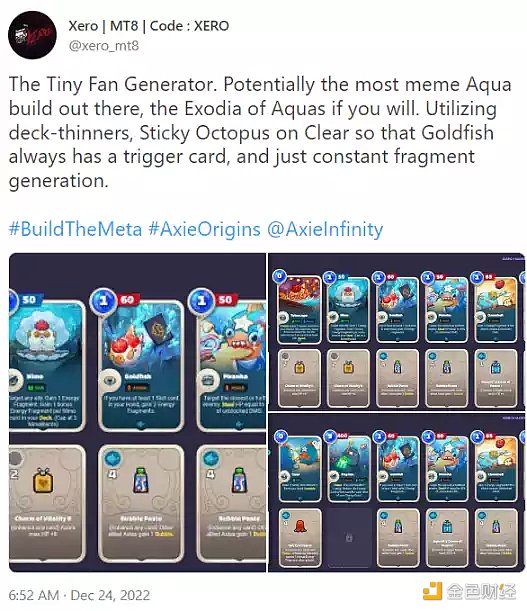 2022 年 4 月,Axie 的创造者 Sky Mavis 发布了 Axie Infinity: Origins,这是其原创战术卡牌对战游戏的优化版本,引入了卡牌更新、符咒和符文制作系统,以及实时战斗。正如你在上面的推文中所看到的,这些新元素让玩家能够通过独特的定制游戏风格享受到许多深度。