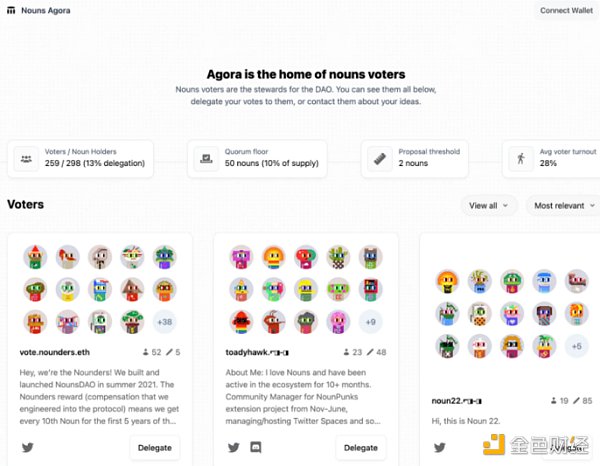 Agora 是一个授权工具,允许 Nouns 持有人对如何使用和分配他们的治理权进行细化控制。它有一些显著的特点,包括: