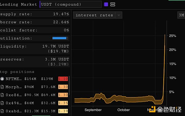 此外,其他 DeFi 用户也在做空 USDT,因为该资产的利用率在 Aave 和 Compound 上分别为 87% 和 92%,导致该稳定币的借款利率飙升。这表明用户正在借入 USDT 以做空,可能是担心 Tether 对 FTX 和 Alameda 有信用风险,虽然二者已经否认了这一指控。USDT 在 11 月 9 日短暂地交易到 0.97 美元,但此后又恢复到了挂钩。