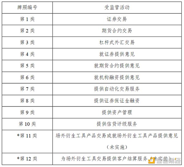 SFC总共规定了12种受监管活动,即要从事以下12种相关的活动均需取得相应的牌照并接受监管,才能在香港合法开展对应的金融活动。其中,与场外衍生工具有关的第11类和第12类牌照还尚未实施。