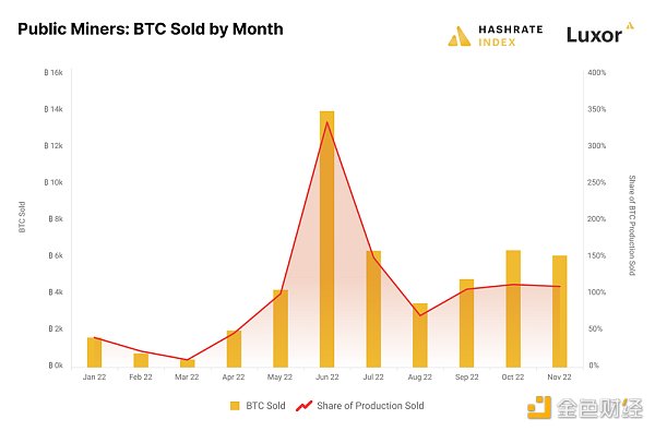 在 2022 年的前四个月,处于囤币模式的上市矿企卖出量低于其产量的 100%。随着 4 月份市场条件的恶化,他们开始清算其比特币存量,并在今年首次出售超过其产量的 100%。6 月时,比特币抛售量达到顶峰,当时抛售量是其产量的 350%。在接下来的几个月里,抛售局面有所缓和,比特币存量已“有条不紊”地被耗尽,出售量为其产量的 100%-150%。