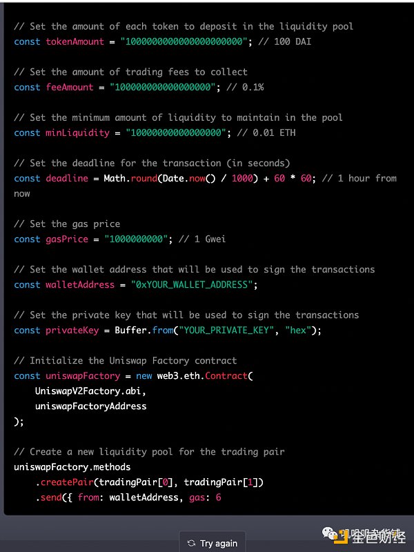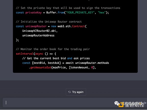 不过如果我们限定这个MEV BOT是On-chain的MEV,chatGPT能搞定吗?于是我们可以在Input这里输入一个非常具体的要求:write a uniswap MEV BOT。结果就是…………它给我们写了一个JS版本的sniper bot!而Sniperbot就是MEV BOT里最简单的一种,理解成夹子就行。