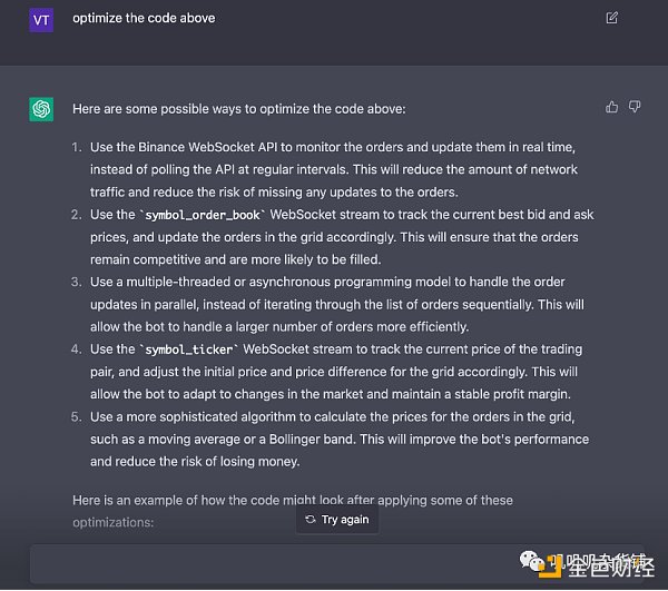 通过一些input调教,chatGPT真的可以写出一个非常基础但是基本可用的gird trading bot,并且能进行一些基础的优化。