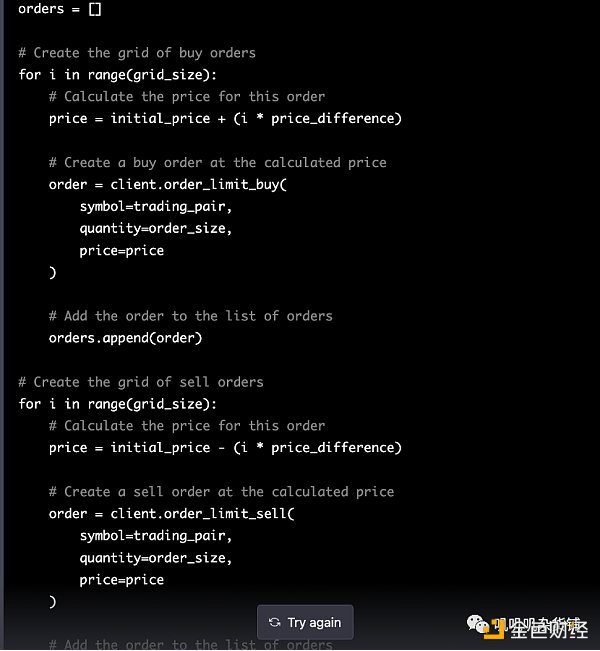 我们尝试在Input区域输入一个具体的需求,例如“write a grid trading bot with binance API“,我们就可以得到如下Python版本的一个网格买入代码模板( 它甚至会告诉我们它的实现思路是什么样的),仔细看看,并没有什么明显的bug,属于不用改就可以用的程度。但是需要注意的是,哪怕每次输入的命令是一样的,但是得到的代码版本也是不同的,不过对于同一个问题,chatGPT给出的思路都是一样的。