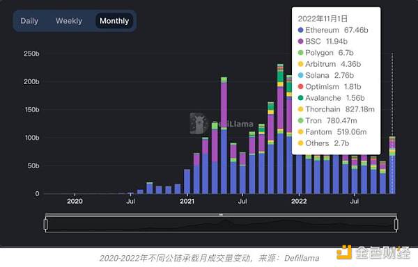 值得注意的是,除 ETH 外,支撑加密市场的其他底层公链,也在熊市中保持着良好的发展态势。与 ETH 占绝对支配地位的 2020 年 12 月不同,在 2022 年 11 月结束时,市面上至少有 10 条成熟公链供开发者与用户选用。其中,Arbitrum、Optimism 等成熟 Layer 2 解决方案,以及 Avalance、Polygon 等在上一轮牛市中兴起的公链,仍然拥有着相对成熟的用户群与开发者群体,承担着百亿美元以上的月成交量。毫无疑问,这为加密市场在下一轮牛市的勃兴打下了坚实基础。
