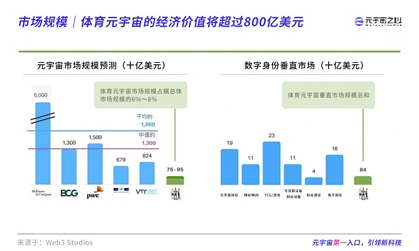 根据Web3金融咨询和投资公司Web3 Studio的一份报告显示,到2030年,体育元宇宙的经济价值预计将增长到800亿美元,该公司总结了众多专家的意见并汇总了一份关于元宇宙体育的报告。