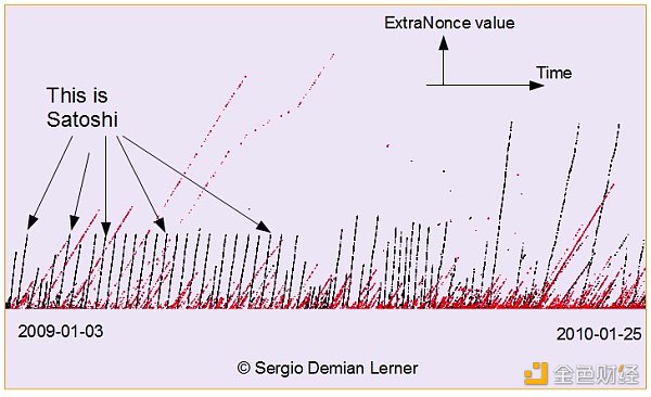 塞尔吉奥发表了下面的图片,其中 Y 轴上为 ExtraNonce 而 X 轴上为区块高度(他错误地将 X 轴标记为时间)。图像显示 ExtraNonce 的坡度随时间而增加。一些斜坡(黑色)据说具有相似的梯度,它们不会重叠,而且一旦达到一定高度它们就会回落到零。这某程度代表了所有的黑线都属于一个矿工(很可能是中本聪)而且这个矿工现在控制了近百万比特币。虽然关于斜坡的梯度,高度和缺乏重叠等技术要点都很难理解和评估,但我们认为图像本身显然非常有说服力。