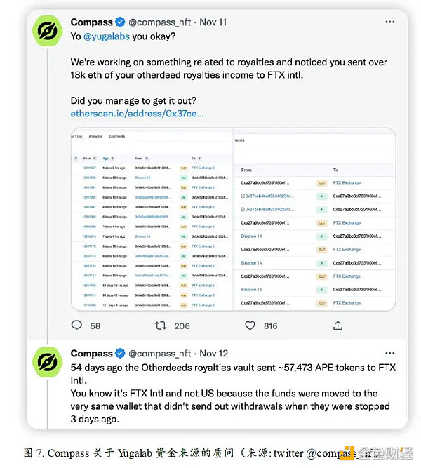 随后不巧的是,NFT 平台 Compass 发推称,YugaLabs有 1.8 万枚ETH 5.7473 万个APE在FTX平台上存放,并公布了其哈希交易记录,对上述yugalabs联合创始人的发言进行了质疑。