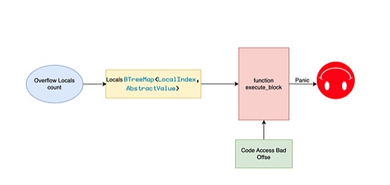 通过上面的介绍,我们知道有一个主循环来扫描代码块,然后调用execute_block函数,之后会合并执行前后的state,当move代码中存在循环,则会跳转到代码块开始,再次执行基本块。 因此,如果我们制造一个循环代码块并利用溢出改变块的state,使 AbstractState 对象中的新的locals map与之前不同,当再次执行 execute_block 函数时,在分析basic block中字节码指令序列的时候会访问新的locals map,这时候如果指令中需要访问的索引在新的AbstractState locals map中不存在,将导致DoS。