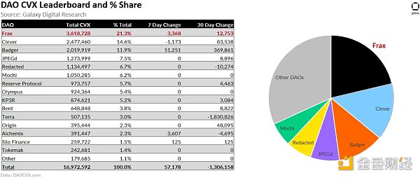 自推出 FraxBP 池子以来,Frax DAO 一直与 Curve 密切合作(FraxBP 池子目前拥有约 5 亿美元的 TVL,超过 Curve 在以太坊上的 3pool)。虽然 Curve 关于选择frxeth 池子预言机在技术上可能是有效的,但考虑到 FRAX 作为DAO CVX 排行榜的领导者对 Curve 的影响,人们质疑以 frxETH 作为唯一市场启动的决策过程当然值得探索,这可能会违背Curve 团队对信任最小化和去中心化的承诺。