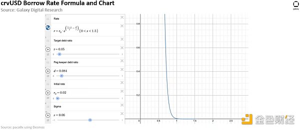 货币政策(利率)。利率已纳入 AMM。随着时间的推移,利率会增加贷款的规模。根据白皮书,crvUSD 的借贷利率将根据 crvUSD 围绕其挂钩的变化进行动态调整(随着 crvUSD 升至 1 美元以上,借贷利率下降,以激励用户借贷,进而增加 crvUSD 的供应;或者,当 crvUSD 低于 1 美元时,借贷利率可以快速增加,以激励借款人偿还贷款并减少 crvUSD 的供应以提高其价格)。借款利率公式为:rate = rate0 * exp(-(p - 1) / sigma) * exp(-peg_keeper_debt / (total_debt * peg_keeper_target_fraction))变量包括:PegKeeper 产生的总债务,用户通过 Controller 产生的总债务,记录两者的比率,crvUSD 的价格,以及基准利率 0。