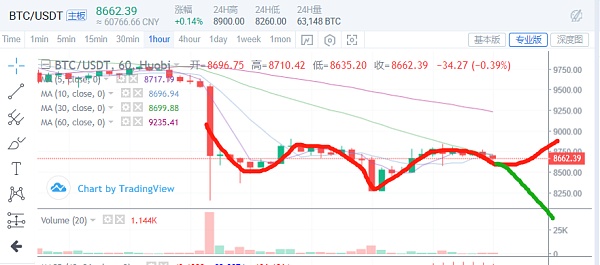 小时图持续缩量,变盘点就是8500这个关键点位,如此操纵的市场很难判断方向,个人认为短期可能会是先上后下。昨天狂人说过,这种小时线级别的单小时暴跌,往往都还会出现一波新低,有些时候是横一横直接下,有些时候是反弹一波再下来,两种结果都会创个新低。所以如果先上后下的话,9100上方可以逐步短期减仓;横盘直接下的话,放量跌破8500可以考虑减仓。