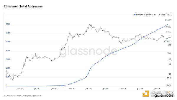 根据Glassnode的数据,现在有4000万个以太坊地址持有ETH,由于其价格在2018年第一周达到历史新高,自此这个数字增长了350%。
