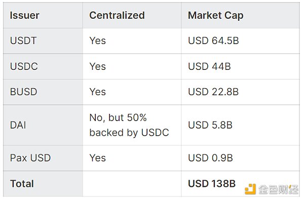 该领域的另一个风险因素是中心化稳定币。下面的表1给出了前5大稳定币发行商的概况,总市值为1380亿美元。然而,DAI作为一个去中心化的发行机构,其中只有4%的供应由DAI管理的,目前由超过50%的USDC支持。这突显出,如果任何单一接触点失效、被监管过度或脱钩,就会有危机蔓延的风险。