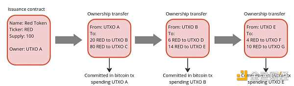 举一个更加现实的例子,一种同质化资产(例如公司股票、稳定币,等等)的发行者可以使用 RGB20 模板,创建一个定义了发行多少代币、资产的名称并携带额外的元数据的合约。然后,它可以定义哪些比特币 UTXO 有权转移被创建的代币的所有权,并分配其它权利给其它 UTXO(例如增发权和重命名资产的权利)。每一个收到由此合约创建的代币的客户端,都可以验证创始合约的内容,并验证自己收到的代币在历史上的每一次所有权转移都遵守了创始合约的规则。