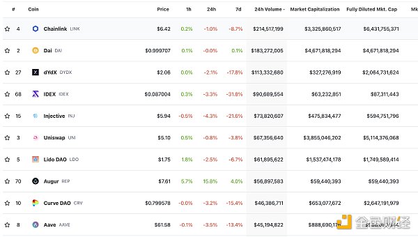 1900/1/1 0:00:00DeFi数据1、DeFi代币总市值:470.47亿美元 DeFi总市值及前十代币 数据来源:coingecko2、过去24小时去中心化交易所的交易量13.