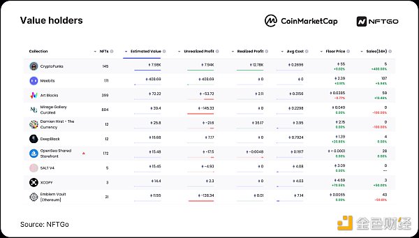 从持有人变化上我们可以更直观的看出蓝筹NFT的变化趋势:这些蓝筹的原持有人有不同程度的抛售,总持有人变少,但是巨鲸持有人变多,NFT开始更集中分布在大资金持有者手中。
