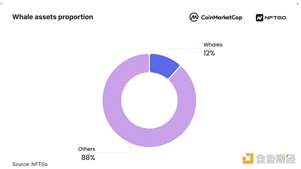 就像上面提到的蓝筹项目占据了最大的市场份额一样,巨鲸的资本也是主导NFT市场走势的最大因素之一。目前,485只鲸鱼持有价值1.11百万ETH的NFT资产,占总市值的11.71%。