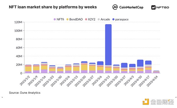 ParaSpace是本季度总借贷市场份额最大的平台,Q1累计市场份额达到1.34亿美元。这主要是由于ParaSpace的V3 LP NFT抵押借贷协议在3月初受到关注,其峰值时超过1,000个MAYC抵押。BendDAO和NFTfi紧随其后,市场份额分别为1.07亿美元和7600万美元。这三个主要的借贷平台占据了市场份额的约65%。