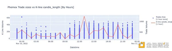 而在 Phemex 交易所中,我们没有从原始交易订单流和 k 线交易量中发掘明显相关性,交易订单的规模没有显示出随机性。与 Binance 相比,交易规模相对停滞。变化的是交易的密度,而不是单个交易规模。