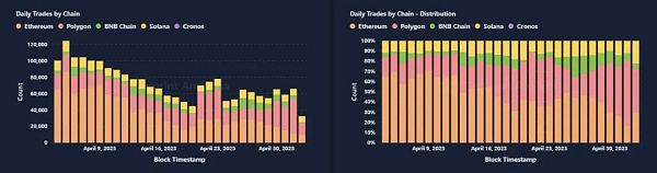 根据 Footprint Analytics 的数据,4 月 5 日,NFT 市场的交易量达到了顶峰,但到月底,每日交易量下降了 50%。这种下降趋势表明 NFT 投资者变得越来越谨慎,因为最初对 NFT 市场的热情似乎已经消退了。