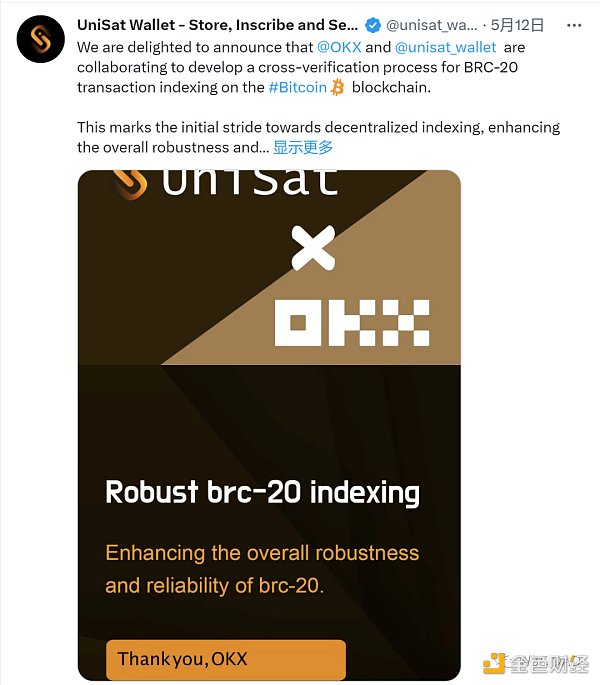 来源:Unisat 推特(https://twitter.com/unisat_wallet?s=21)因此,目前Unisat正在与OKEX、火必建立合作,共建BRC20标准及索引。
