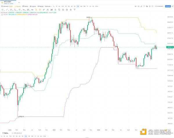 比特币在第一季度测试了15000美元的支撑位,并开始了一路反弹。进入新的一个季度,BTC也开始了新的周线和月线级别的旅程。我们试图引入唐奇安通道(Donchian Channel),用于显示市场价格的波动性。(注:它由三条不同颜色的曲线组成,通常用20天周期内的最高价和最低价来计算。当通道变窄时,市场波动性较小,而当通道变宽时,市场波动性较大。唐奇安通道可用于确定买卖时机,当价格突破通道上轨时,可能出现买入信号;而当价格突破通道下轨时,可能出现卖出信号。)