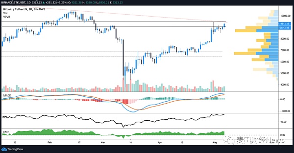 如果比特币价格能够有效突破这一阻力位,那么之后比特币就很有可能会重回1万美元上方,并再次向10300-10500美元的阻力区间发起冲击,这也是去年9月之后,比特币一直无法突破的位置。