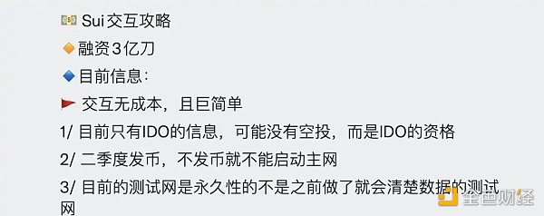 但是,纵观近半年 Sui 官方关于空投的言论,其实并不算明确,「当前、目前、暂无、正式」的空投计划,对于用户来说,这是并不是一类完全否定的词,直到公布 IEO 前几天其联创才发布了「没有 SUI 空投,永远不会有」的言论,一锤定音。某种程度上讲,模棱两可的「当前、暂无、正式」词语并不能影响他们去交互体验,此前的一系列关于空投的声明似乎是在提醒你去体验 Sui,尤其对于中文用户来说,社交媒体一直都会出现新的 Sui 交互教程。在官方发言上看,Sui 有点蹭着本不存在的「空投计划」来做宣传的意思。