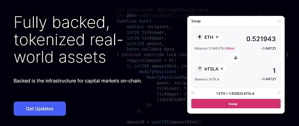 Backed Finance 是一个 RWA 代币交易平台,其中,股票、ETF 等 RWA 被代币化为可跟踪市场价格的 ERC-20 代币。代币可在不同钱包间自由转移,并 100% 由 RWA 储备支持。