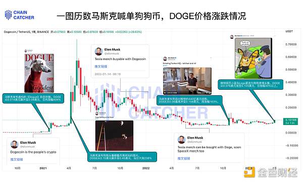 马斯克公开操盘喊单狗狗币,在加密市场早已不是新闻,自2021年开始,马斯克不止一次表达对狗狗币的看好,称它是“人民的加密货币”,是自己最爱的”货币,还多次发布狗狗币表情包,他时不时会在推特上发一些与狗狗币有关的内容,导致狗狗币币价涨跌波动剧烈。