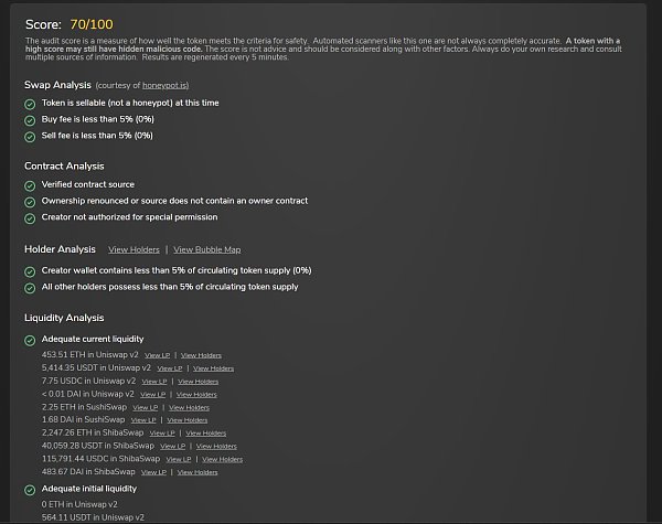 虽然许多人都想找到下一个百倍项目,但更重要的是要知道如何发现危险信号以降低被 Rug Pull 的风险。Token Sniffer 可以帮助你识别市面上明显的 Rug Pull 局。你只需要粘贴项目的合约地址,它会分析该地址并提示是否存在潜在的风险。