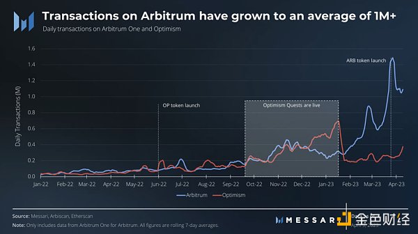 2022 年,Arbitrum 和 Optimism 的日均交易量相似,分别为 153,000 和 155,000。然而,Optimism 的活动似乎主要是由于其激励计划的支持,在 2023 年 1 月结束,就经历了急剧下降。另一方面,由于空投的预期,Arbitrum 在 2023 年经历了急剧的增长,空投当天活动量达到了 270 万。截至目前,Arbitrum 的日均交易量为 663,000,是 Optimism 的两倍以上,后者的日均交易量为 302,000。