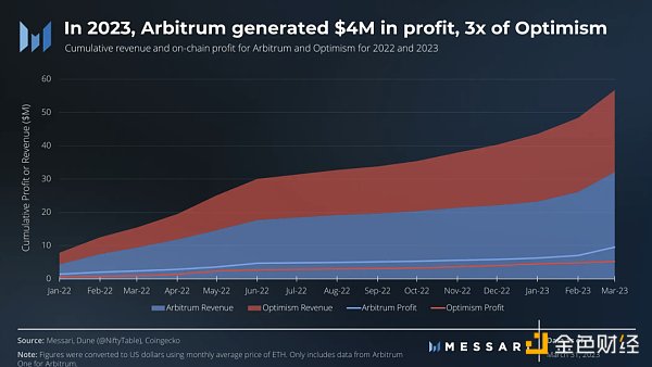 Arbitrum 在空投当天经历了活动量的大幅增加,包括更高的交易量、活跃用户、排序器收入和利润。由于分析的期间是 2023 年,这在某种程度上夸大了 Arbitrum 的采用度指标。