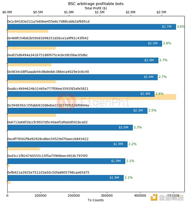 与以太坊相比,BNB Chain 上的套利机器人面临的竞争并不激烈。前 10 名套利机器人在 BNB Chain 上产生的利润占比 25% ,低于以太坊的 51.3% 。因此,BNB Chain 上套利机器人的机会比以太坊上的套利机器人更公平。新人更有可能找到一个友好的环境来探索 BNB Chain。