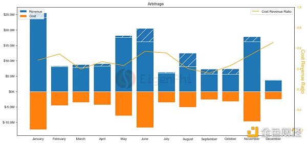 总体来说,套利搜索者产生的收入在 1 月、 5 月、 6 月与 11 月相对较高,其余月份则表现稳定。除 11 月,三明治机器人的收入在第三、四季度均呈下降趋势。清算交易产生的月度收入中, 5 月、 6 月、 11 月的收入明显高于其他月份,因为 ETH 在 5 月、 6 月的大幅下跌与 CRV 空头挤压事件导致了清算机会。