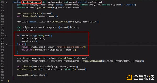 在本次攻击中,Etoken 合约的 donateToReserves 函数没有正确检查用户实际持有的代币数量和捐赠后用户账本的健康状态。攻击者利用这个漏洞,捐赠了 1 亿个 eDAI,而实际上攻击者只质押了 3000 万个 DAI。