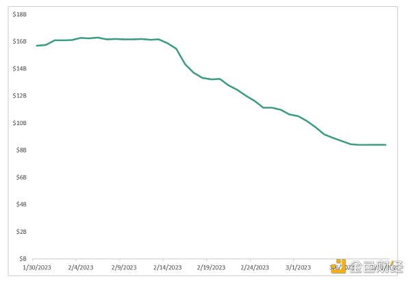 最近的监管焦点似乎是中心化稳定币。例如,纽约金融服务部(NYDFS)最近宣布对白标稳定币发行商Paxos Trust(Paxos)采取行动,命令他们停止发行中心化稳定币币安USD(BUSD)。BUSD于2019年由Paxos和加密货币交易所币安合作发行,并于2022年11月达到230亿美元的市值。NYDFS声称Paxos“违反了对币安和BUSD客户(BUSD由Paxos发行)进行量身定制的定期风险评估和尽职调查以防止不良行为者使用该平台的义务。”此外,美国证券交易委员会(SEC)也向Paxos发布了Wells Notice(韦尔斯通知),声称BUSD是一种证券。自2023年2月初做此宣布以来,BUSD的市值已经下降了近50%,从160亿美元降至80亿美元(见图13)。虽然这并不会直接影响其他中心化稳定币,但它暴露了中心化稳定币发行商受监管机构行动影响的程度。