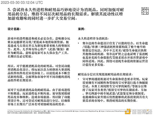 该设计的意义在于,通过尝试将耐用品巧妙地设计为消耗品,同时加强对耐用品的分层,可维持不同层次耐用品的长期需求,继续延伸的话还可以通过解锁其流动性,在增加游戏趣味的同时进一步扩大交易空间。