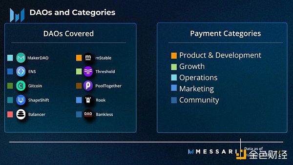 Messari 收集了 DAO 向各自工作组提供的 2022 年支付数据,来分析资金情况。Messari 选择的 DAO 是基于它们各自的结构,目标是那些通过内部工作组运作的 DAO。尽管有这些标准,但由于所涵盖的 DAO 的新组织结构和流程,一些历史数据是不完整的。例如,并非所有的 DAO 在发放薪酬时都报告或保存全职员工的历史记录。一些DAO缺乏会计透明度,并在链下投票中商定一个金额,然后在未公开的时间以未公开数量的稳定币和/或原生代币支付。